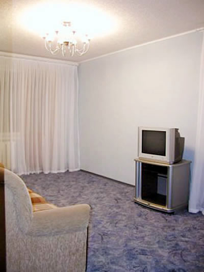 This newly remodeled 2 room apartment uses blue pastel colors to set a tranquil mood for your stay in Sumy. Plush carpeting, comfortable new furniture and rich hues of ceramic tile in the kitchen are comforting and enjoyable extras to this setting. The bedroom features a king size bed, always a plus. Entry is via a coded metal security door with and features a hidden alarm button.
